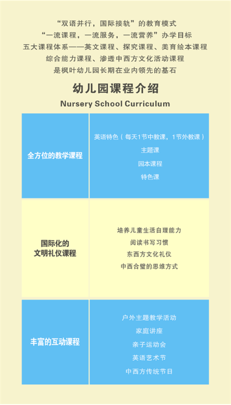 在多年来的探索与实践中,枫叶幼儿园通过对课程的研究与开发,逐渐使课程延伸到幼儿成长的各个领域:在多元中英文主题活动中,促进幼儿综合发展;在园本特色课程中,促进幼儿的全方位潜能和个性的发展。从而形成了具有枫叶特色的五大课程体系——即探究课程、英文课程、美育绘本课程、综合能力课程、渗透中西方文化的活动课程。