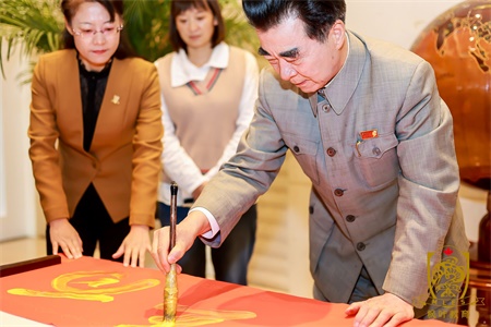 在接受完同学们的献花后,学校领导引导张将军参加校史馆。参观过程中,张将军对枫叶先进的教育理念和独特的人文环境赞不绝口,盛赞西安枫叶是他参观过的融贯中西的国际学校。为了表达对枫叶教育和枫叶学子的期待和祝福,张将军即兴挥毫泼墨,为枫叶题写了“百年枫叶愿景”等多幅墨宝。兼具艺术家和军人身份的张将军,题字笔法遒劲,恢弘大气,字中藏画,画中有诗,让在场的领导和师生感到赏心悦目,惊叹不已。红色艺术家对传统文化的热爱再次激励着枫叶广大师生,让大家更加坚信弘扬中华优秀传统文化是枫叶不断走向辉煌的制胜法宝。