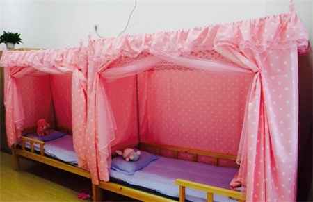 一到三年级(含小一预备班)学生宿舍床铺为独立实木小床,宿舍是孩子们的第二个家,女生喜欢的粉色更是不能少。衣柜用来存放个人物品。