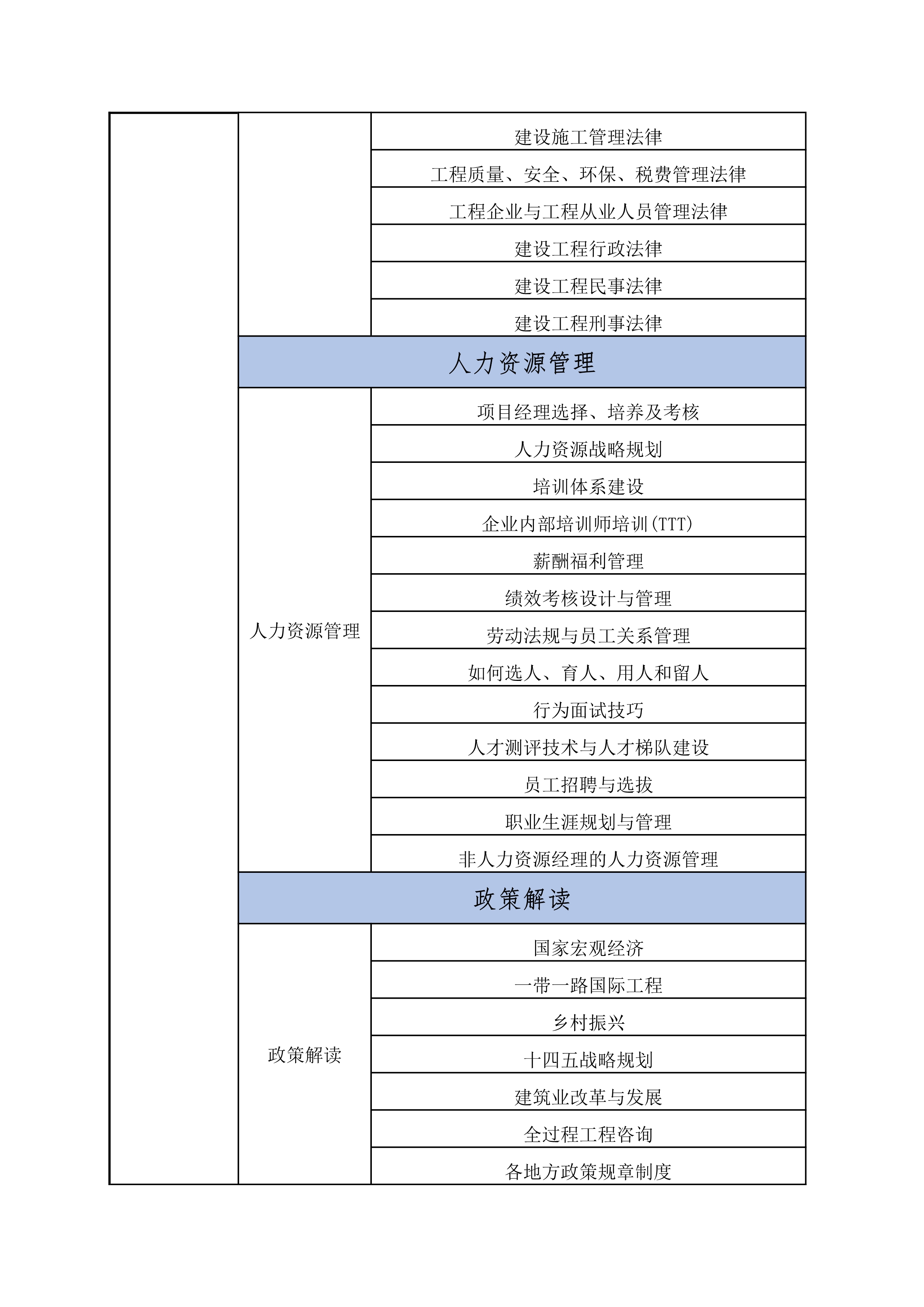 项目综述,人员激励,财税筹划,采购管理,资金管理,合同管 控,发包/分包,项目管理,风险防控,创优工程,总承包管理等。