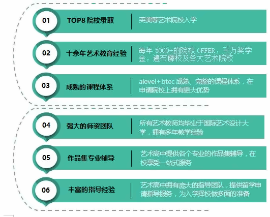 A-Level课程在艺术方面开设了纯艺术、平面设计、纺织品设计、3D设计四门艺术课程,文化课开设数学、中文、体育,在标化成绩方向上同时开设雅思、托福、外教口语课程。丰富的专 业课程和文化课程让学生在校内即可满足申请的全部需求。