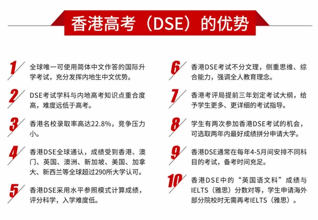 香港高考DSE是指香港中学文凭试(Hong Kong Diploma of Secondary Education),是香港高中生的学业水平考试,是所有高中生毕业进入大学的统一考试,该考试由香港考评局官方举办,等同于内地高考,俗称“香港高考”。2017年,香港DSE 面向内地学生开放招生报名,通过DSE 考试的学生即具有高中等同学历,学生可根据DSE各科考试成绩报考大学. 内地学生通过香港DSE 考试享有同等权利进入香港澳门各所大学以及海外名校。