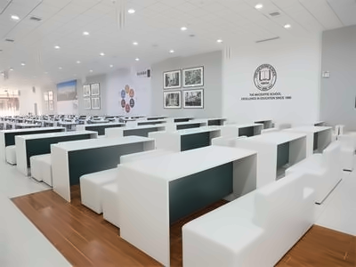 学生公寓采用男女生分楼管理,设计有4人间和双人间,房间内设有独立洗浴卫生间,配备有新风系统。公寓内设置有独立的阅览室、自习室和家长接待室,此外还配有独立的洗衣房,洗衣房内的洗衣机均为全自动滚筒式洗衣机,公寓内高端、人性化的设计使师生尽享舒适与方便。